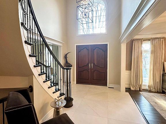 Welcome to the epitome of luxury living with the highest quality of craftsmanship and materials. From the two story soaring foyer with marble floor, custom wrought iron banister with wool runner, designer wall covering, custom lighting and chandelier. The expansive great room features coffered ceiling, designer chandelier, gas burning linear fireplace with full porcelain surround. New custom designed kitchen features Thermador appliances, custom cabinetry, imported solid quartz countertops, and center island. The primary sitting room features a gas burning fireplace with full marble surround Fully finished lower level with jockey style bar and custom built-in entertainment center. Flagstone patio with stone retaining wall and babbling fountain.