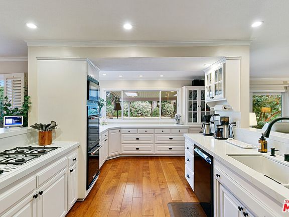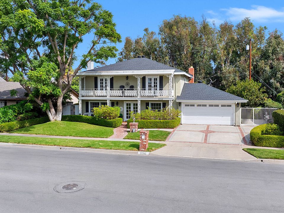 Nestled in the heart of Tustin, this beautifully maintained five-bedroom Colonial home blends timeless charm with modern comfort in a quiet neighborhood. Situated on a large lot totaling nearly 1/4 acre, the property boasts expansive lawns framed by lush, mature landscaping. Inside, hardwood floors flow throughout light-filled living spaces, creating a warm, inviting atmosphere. A remodeled kitchen features quartz countertops, a breakfast bar, and transitions seamlessly into a dining area and cozy den with a brick fireplace. A spacious living room with a second marble-framed fireplace offers the ideal setting for gatherings or movie nights, complete with a Sonos speaker system. Upstairs, a large primary suite is a peaceful retreat, complete with a walk-in closet and updated spa-like bathroom with dual vanities, a soaking tub, and a rain shower. A full bathroom with dual vanities and three additional bedrooms complete the second floor, two of which offer access to an outdoor balcony spanning the front of the home. A convenient entry-level bedroom suite provides flexibility for guests or a home office. The backyard is an entertainer's dream, with a covered brick patio with recessed lighting, a built-in BBQ, and an outdoor firepit. Electrical has been run to a gravel pad, the perfect place for a jacuzzi, sauna, or cold plunge. Mature eucalyptus, fruit trees, and hedges provide privacy and a verdant atmosphere around the large grassy lawn. Additional features include an attached two-car garage and a dog run. Located in Tustin Unified School District, enjoy access and proximity to highly-rated schools, local markets, restaurants, and more. Classic curb appeal meets modern livability in this exceptional residence.