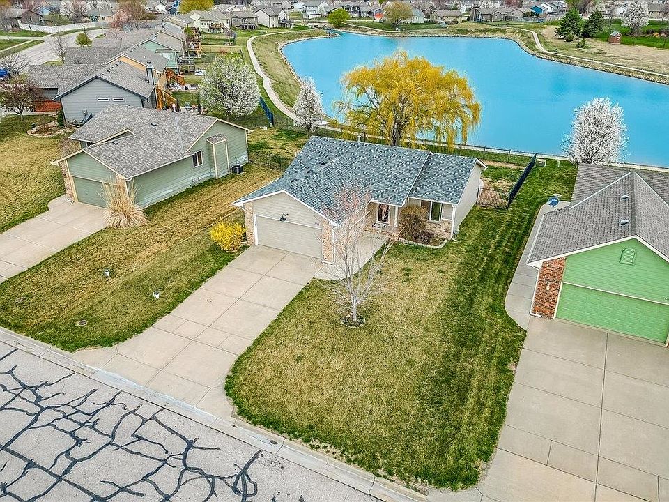 Welcome to your next home! This fantastic 3 bed, 2 bath home in Wichita, KS, sits on a magnificent lake lot in the highly esteemed Maize School District. NO SPECIAL TAXES! Enjoy an inviting living room, island kitchen, and dining area with a view of the lake. Entertain in the backyard with a custom patio and built-in fire pit. Access the stocked fishing lake with a paved walking path from your backyard. Enjoy a plush lawn all summer long as the sprinkler system is connected to an irrigation well. The main floor features a primary bedroom with a walk-in closet and lake views. A lower level offers a huge family room, third bedroom, and second full bathroom. Don't miss out on this wonderful home!