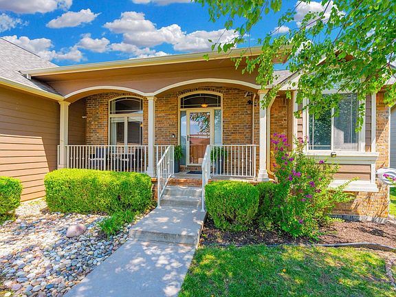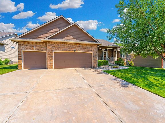 Fantastic ranch style home in West Wichita with 5 bdrms. 3 baths, 3-car garage and a mid-level walkout. New hardwood flooring and 10 ft. ceilings throughout main floor living areas, gas fireplace in large living room with built-in bookshelves and cabinets, knockdown ceilings, and main floor laundry. Kitchen features stainless steel appliances which include a gas stove, built-in microwave and a new dishwasher. Eating bar and a breakfast nook will allow for ample dining, and a separate formal dining room for all your needs. Large Master suite includes a master bath with 2 sinks, walk-in closet, soaker tub and separate shower. The full finished view-out basement has a large family room with a large storage room, newly finished bath with a large walk-in shower, and 2 more bedrooms. Outdoors you can enjoy evenings on the screened in patio, fenced yard, sprinkler system and irrigation well. Wooded lot behind this property allows for your privacy. Roof replaced in 2019. Special taxes have been paid off! Call today for your private showing.