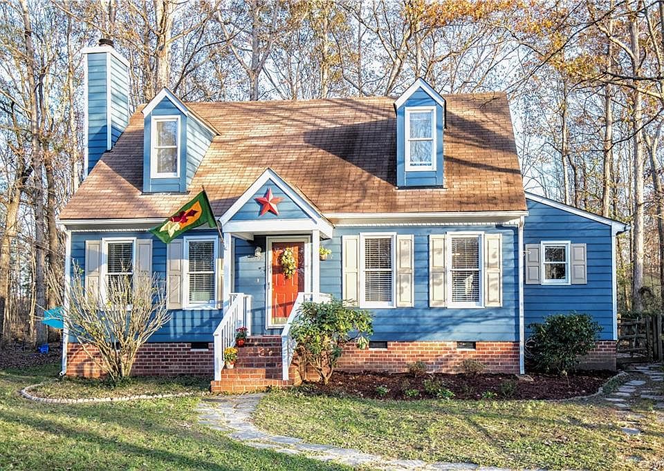 Charming cape on cul-de-sac lot is ready for new owners! Features include wood-burning fireplace, bamboo flooring, NEW butcherblock counters, stainless steel appliances, updated baths, formal dining room (which could serve as home office if needed), first floor bedroom has access to full bathroom and could be used as the primary bedroom, upstairs are two spacious bedrooms including the Primary bedroom with walk-in closet and direct access to updated full bath. Outside enjoy the two-tiered deck overlooking fenced rear yard, and spacious detached storage shed will hold all your tools and toys! HVAC and dishwasher were both replaced in 2019; washer and dryer convey. Enjoy all the amenities Brandermill has to offer with over 15 miles of trails, fishing and boating on the 1700 acre reservoir, pool and club memberships, playgrounds and fields, all with close proximity to restaurants, shopping and schools. Make this house your next HOME!