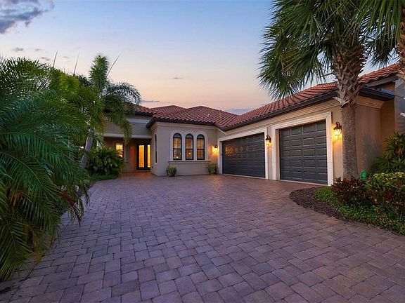 Welcome to Lakewood Ranch's premier all-inclusive golfing and upscale lifestyle community of Esplanade. This luxurious Taylor Morrison Luca home has been redone in 2019 and is filled with fine upgrades, functional spaces, designer details, and includes golf membership and social membership to Esplanade. The Florida curb appeal invites you in with palms, privacy hedge, and grounds maintenance included. Enter through the double glass front doors into a spacious foyer where you'll find the first glimpses of the design finishes that are abundant in this home. Murano Italy glass chandeliers, coffered ceilings, crown molding, luxurious designer wallpaper, large format tile flooring, and timeless color palette are just a few of the impressive details that make this residence special. The spacious great room showcases a custom built-in entertainment center with fireplace, display shelving and LED accent lighting, and glass sliding doors to the lanai. Just off the great room is the formal dining encased with designer wallpaper, high-end chandelier, and floating built-in cabinetry. Chefs will rejoice in the gourmet kitchen featuring a large island with quartz counters and dual quartz waterfall edge island, full-height quartz backsplash, walk-in pantry, and cabinetry with roll-out drawers and island storage. For the perfect meals, you are equipped with a stainless steel appliance suite including a gas cooktop and two built-in ovens. Next to the cleverly hidden oversized, built-in refrigerator with cabinet panels, is a full-sized dual zone Liebherr wine cooler with 80 bottle capacity to hold your wine collection. The perfect complement to the indoor kitchen resides in the custom outdoor kitchen through the pocketing sliding glass doors. A wraparound bar provides space for everyone to participate, plus stone counters, full-height stone backsplash, stacked stone hood, display cabinetry, and stainless steel gas grill, beverage cooler and ice maker complete the kitchen. Bringing the feeling of the outdoors to the paver lanai, you'll be enchanted by stacked stone column bases, wood ceiling that cascades down behind the outdoor kitchen, stacked stone feature wall, and a sparkling heated pool and spa. Just beyond the custom privacy screens built into the lanai cage, you'll catch a glimpse of the nearby lake. The master suite features wood-look plank tile flooring, seating area overlooking the lanai, and double door entry to the large master bathroom. Graced by designer wallpaper, the master bath includes dual sinks, stone counters, make up area, soaking tub, frameless glass enclosed shower, and custom built walk-in closet. Guests will enjoy the two private guest suites each with an en-suite full bathroom. Finishing off this impressive residence is the office with a walk-in closet, custom TV frame, and safe (but could easily be used as a fourth bedroom), laundry room, private powder bathroom for your guests, and three-car side loading garage with custom cabinetry. Peace of mind is offered with the whole house water softener, water filtration system, and ultraviolet system in attic. Esplanade is a gated community with world-class amenities including championship golf course, driving range, tennis and pickleball courts, fitness center, community pool, clubhouses, restaurant, full-time Lifestyle Director, and more! Lakewood Ranch is one of the top-selling master-planned communities in the country with delightful shopping, dining, schools and nearby beaches.