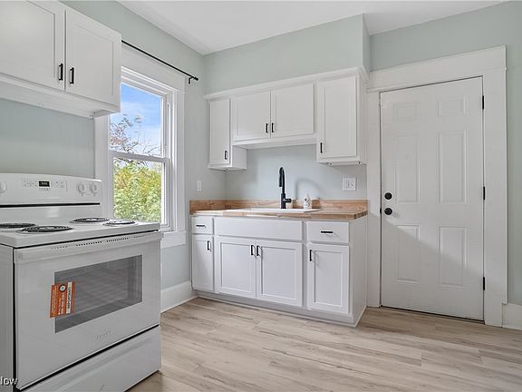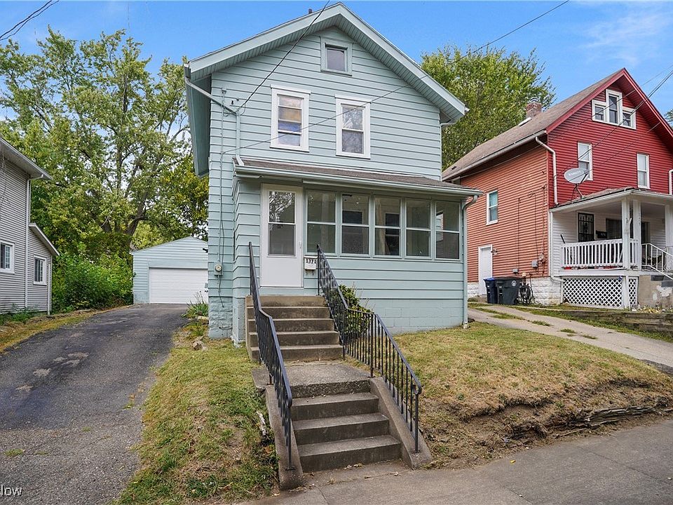 Enjoy your new totally remodeled home, complete with new appliances and a large detached 2 car garage! Not only does this home feature 3 bedrooms, there is a lovely enclosed front porch for cozy mornings with coffee. The back of the house has a second enclosed porch, perfect to dry off your fur baby on those wet and muddy days! This Goodyear Heights beauty was just remodeled in the last 3-4 months. Some of the upgrades are as follows: New kitchen cabinets, flooring, sink, new fridge and stove, New bathroom shower, vanity, and fan, glass block basement windows, New exterior paint, and interior, new LVP flooring throughout first floor, with a seller bonus of allowing buyer to choose their color of a preselected prepaid carpet for the upstairs, New garage door and opener, and a new hot water tank! Prior to this major rehab, AC was added in 2021 and new gutters on the garage in 2023. This new price reflects that the seller decided to add appliances and carpeting to help the new buyer. Additionally, there is a washer and dryer that the seller will convey.