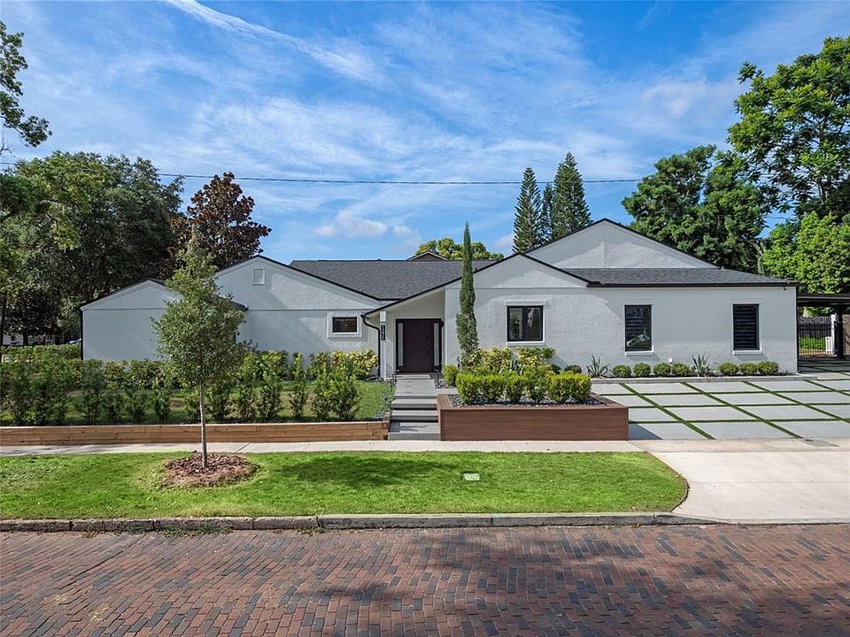 One or more photo(s) has been virtually staged. As you enter this renovated 4-bedroom, 2.5-bathroom home within the city limits of Winter Park, you're immediately welcomed by a bright, open living and dining area anchored by a stunning wet bar, complete with sink, cabinetry, ice maker, and floating shelves. All completed with light modern porcelain tile flooring. To your right, the kitchen makes a bold statement with dramatic 4.5-inch thick countertops, waterfall-edge island, oversized farm sink, and high-end appliances including a Thermador induction stove and Whirlpool double oven, microwave, dishwasher, and fridge/freezer. Custom soft-close cabinetry blends seamlessly into the open layout, offering style and serious storage. Just beyond the hurricane rated sliding glass doors, you'll find a covered lanai and spacious yard with a mix of grass and artificial turf, ideal for entertaining, relaxing, or adding a future pool. The primary suite is tucked away on the left side of the home, offering peace and privacy. It features soft lighting, remote-controlled shades, and two walk-in closets with built-ins. The spa-like en-suite bathroom combines wood and stone textures, a floating dual-sink vanity, and a large walk-in rain shower, all designed with modern feel. Two additional bedrooms and a full bathroom are located down the same hallway, separated from the main living space by modern barn doors, perfect for creating a private wing for family or guests. On the opposite side of the home, a fourth bedroom makes a perfect office or guest suite. A nearby half bath opens to the outside, making it an ideal future pool bath. The laundry room is equipped with LG Signature washer and dryer, a drying closet, sink, and built-in storage. Adjacent to the laundry area is a stylish mudroom with custom built-ins to keep everything organized. Both the attached 2-car garage and carport make parking effortless. The garage is climate-controlled with a split AC unit and finished with sleek epoxy flooring, perfect for a gym, workshop, or additional storage. The garage is also equipped with EV charging capabilities. Set on a generous 0.33-acre corner lot, this property offers extra outdoor space, privacy, and potential, whether for a future pool, garden, or entertaining area. Additional upgrades include a whole-house Generac generator, a tankless water heater with softener and filtration system, hurricane-rated windows and sliding doors, new roof (2021), updated plumbing and electrical (2022), and two new AC systems (2022). Non-textured walls and ceilings, smart lighting, and clean, minimalist finishes round out the home’s modern aesthetic. Every detail of this home has been carefully curated to deliver a lifestyle of comfort, style, and function, a true modern retreat in the heart of Winter Park. This home is located just a short drive away from Park Avenue and its many restaurants and other businesses. Conveniently located close to major highways for easy commuting, schedule your private tour today.