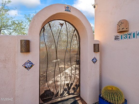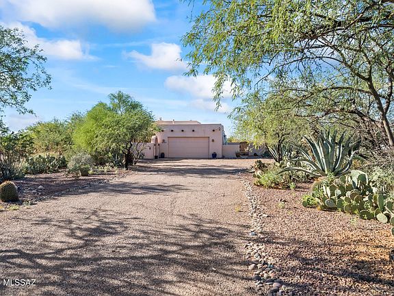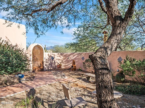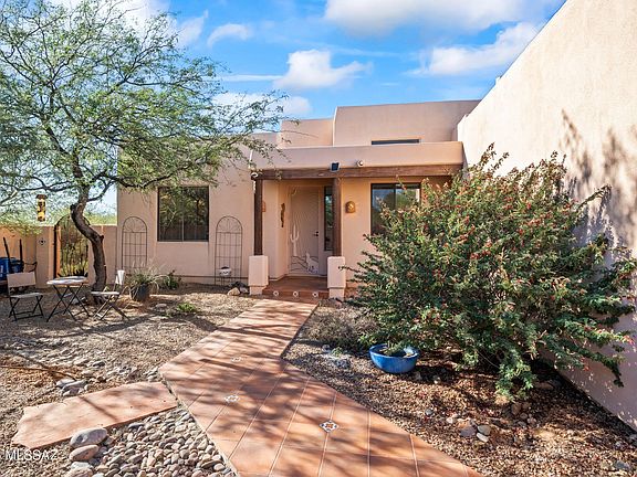 Santa Fe-style ranch on a .984-acre cul-de-sac lot in Vail. Gated front courtyard leads to a spacious great room with high ceilings and a kiva fireplace opening to the kitchen and formal dining. Kitchen includes a full appliance package and flows to a sunny breakfast room. Split plan with two guest bedrooms and a full bath. Oversized primary suite features French doors to the tiled, extended covered patio, a large bath, and a walk-in closet. North-facing, fenced backyard showcases PebbleTec pool & spa and sweeping Rincon Mountain views.