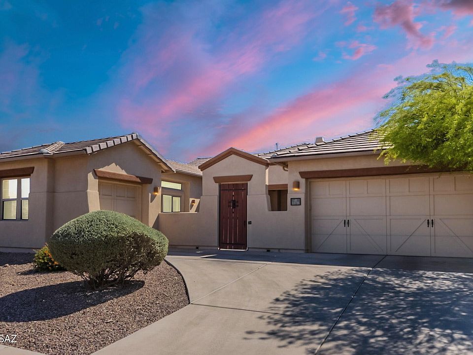 Tucked away in the serene and desirable Oro Valley private enclave of gated Siena at Rancho Vistoso, this single-story treasure offers a spacious 2779 sqft of comfortable living (enhanced by new HVAC installation - 06/2025). Enter through the towering front gate leading to the courtyard with substantial entertainment space. The courtyard leads to the home's front door, the door to the 3rd garage bay and the slider entrance to the Guest Casita which houses the 4th bedroom, walk in closet and full bath. The entry foyer showcases an intricate natural stone medallion, and public areas feature an open floorplan with classic 18'' tile as well as soaring 12' ceilings, large, picturesque windows and 8' interior doors. The light and bright Great Room, with gas fireplace opens to the hi-end kitchen featuring gorgeous 42" staggered cabinets with pullouts, 5-burner gas cooktop, a walk-in pantry, counter seating, a roomy breakfast nook, granite counters and counter-to-cabinet mosaic backsplash. The laundry room includes abundant storage, counter space and sink. The generous primary suite has a shuttered bay window looking out to backyard; the primary bath offers 2 vanities, 2 walk-in closets, a garden tub and separate shower. The marvelous backyard encompasses a covered patio with ceiling fans, a built-in stacked-stone BBQ with extended counter seating. Enhancing the area are sections of refreshing "turf", and easy-care plantings. Both the two-car and single-car garages have easy-care epoxy floors and enclosed storage. This lovely home is well-suited for comfortable full-time living or as a seasonal residence. Enjoy the Arizona lifestyle behind the beautiful gates that encompass this elite subdivision. Look in Documents tab for both the FEATURES AND DETAILS and THE FABULOUS LOCATION of this lovely home.