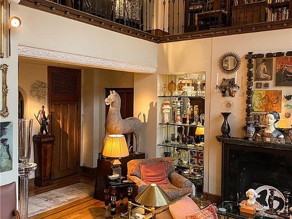 Upstairs, a staircase with tall leaded windows leads to a gallery overlooking the Great Room, featuring wrought-iron rails and a built-in office area. An upholstered leather door opens to the expansive Master Suite, created from two original bedrooms. The suite accommodates a seating area and has a remodeled Master Bath with modern fixtures, a soaking tub, bidet, and custom tilework. A dressing room provides solid oak cabinetry, a granite counter, and a built-in ironing board, while a walk-in closet includes a vanity, storage, and in-unit laundry.