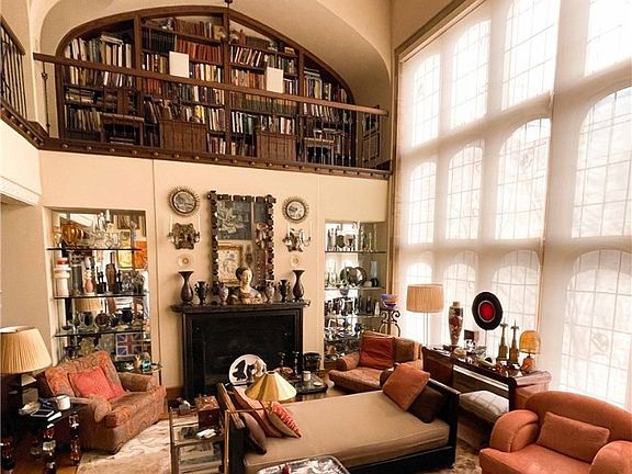 The residence features a spectacular two-story Great Room with soaring, stone-framed leaded glass windows, intricate ceiling details, remote-controlled Lutron shades, and a contemporary black marble fireplace. Modern upgrades include new electrical and plumbing throughout. A Wi-Fi enabled 4-zone Honeywell thermostat controls central air conditioning and the building's steam heat. A whole-house, Wi-Fi ready music system with iPhone accessibility is also included.