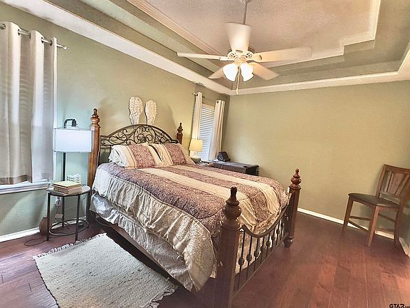 Ready, Set, Go! Incredible Deal in South Tyler! This inviting 3-bedroom, 2-bathroom home with a 2-car garage sits on a spacious lot in a quiet cul-de-sac, offering both comfort and convenience. The open-concept design showcases a generous living area with a wood-burning fireplace, elegant crown molding, wood flooring, and abundant natural light from a full wall of windows. The thoughtfully designed kitchen flows seamlessly into the dining area and living room, making it perfect for gatherings. The primary suite features elegant tray ceilings, and the attached bathroom includes dual vanities, a relaxing jetted tub, a roomy shower, and a large closet. The guest bedrooms offer ample space for family or visitors. An additional room off the kitchen and utility room offers flexible use as a home office or fourth sleeping area! Outdoors, the expansive backyard is beautifully landscaped with a covered patio, providing room for a pool or outdoor entertainment area. The fenced yard includes double doors, allowing for boat storage—ideal with Lake Palestine just a five-minute drive away! This home is move-in ready with numerous updates, including a covered back patio, new flooring, fresh paint, updated fixtures, HVAC, and hot water heater. Don’t miss out—this home won’t last long!