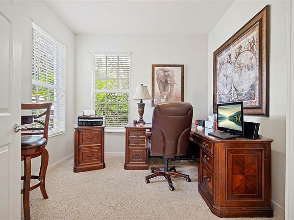 Looking for a low maintenance Florida home in a lakeside community then this is the one for you. The first thing you will notice as you walk up to this home is the lovely mature landscaping and the brand new roof so no worries there. Enter the home through the large door and immediately feel the open living feel with the living room, dining room and kitchen featuring nice wooden cabinets and bar area. Need some privacy for your office or maybe a craft room, then enter the double french doors to find a nice sized den/office space. The home is bright and airy with lots of light and the double sliders lead to a large screened in porch overlooking a quiet grassy space. The master bedroom is very big and features a walk in closet and an ensuite bathroom with a shower and double vanity. The second bedroom is also large and has enough room comfortably for a king or two double/queen sized beds. The second bathroom has a tub shower and a single vanity. The indoor laundry room makes for convenience and storage. The fees cover roof replacement, exterior painting, lawn maintenance and irrigation and trash. The amenities are beautiful and include a large pool and a clubhouse where you can attend activities such as Bingo, Bunko, Music Bingo, Pilates, and family and adult events.if you like sports, then join in with the fitness related classes, or play tennis or pickleball or play some basketball on the half court. Like fishing, then utilize the fishing dock . Maybe bring the family to the playground. Never a dull moment for the whole family. Do not miss out on this beautiful home.