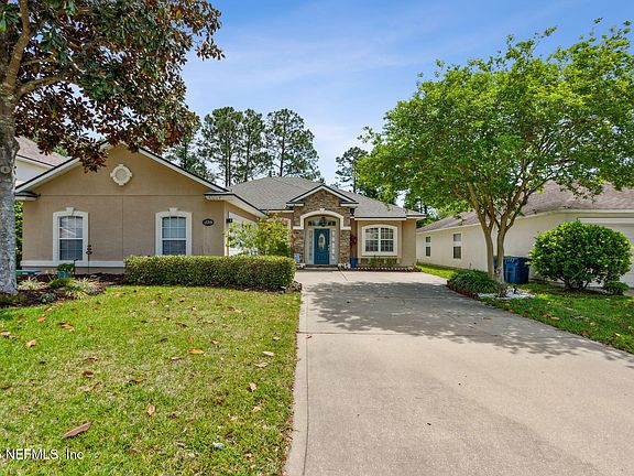 Welcome to this beautifully maintained 4-bedroom, 2-bath home nestled on a wooded, fenced-in lot. This home features a desirable split floor plan for added privacy and a large family room with a cozy gas fireplace, perfect for gathering with loved ones. The kitchen offers a breakfast bar, all stainless steel appliances, an eat-in area, and a spacious walk-in pantry, ideal for everyday living and entertaining. The primary suite offers a relaxing retreat with double tray ceilings, a generous walk-in closet, double vanities in primary bath, a garden tub, and a newly renovated shower. Step outside through sliding doors to the screened in covered lanai, outside lanai is complete with a deck, fire pit, and a Tuff Shed for extra storage. The backyard offers plenty of room for kids or pets to play and enjoy the outdoors. Additional highlights are a NEWER ROOF, 6 YEARS OLD. And inside laundry. Enjoy the community pool, playgrounds, walking track and walking/hiking trail to the local Sheffield Park. Minutes away from new grocery store. And short distance from Rivercity Marketplace, Mayport and Kingsbay bases and the airport.
