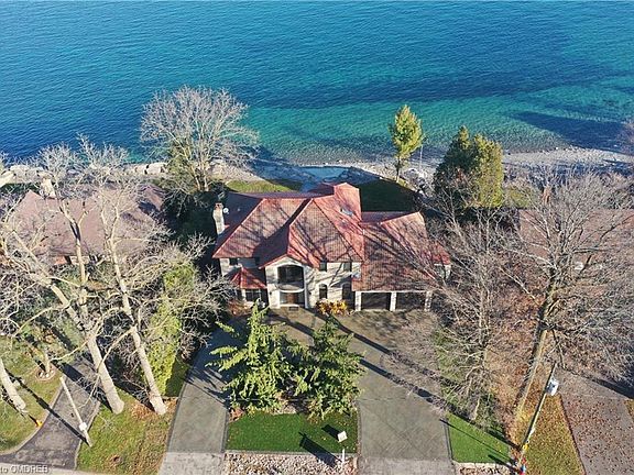 LAKEFRONT WITH RIPARIAN RIGHTS, 3 houses from Coronation Park, Custom built in 1998 by current owner, 1st time offered! ALL STONE Exterior-No siding or brick,Clay Tile Roof and welcoming Pond/Armour Stone WATER FEATURE are accented with custom concrete Circular driveway, matching walkways and Rich artificial grass front yard. Step into custom Hardwood/Granite flooring through most rooms, All Solid Oak trim&interior Doors w/open Double Oak staircases for loads of natural light and Lake views from everywhere. Unique 2nd floor bridge overlooks the dining room with soaring 17 ft ceilings and incredible Lake views. Dining room is over looked by the Living room, ideal for entertaining/lounging with clear lake views. Great Kitchen space, heated floors, with a huge pantry and Garage access-open to the Family room with Gas fireplace and custom Granite surround&Hearth. Kitchen eating area features a steel door walk out to matching custom concrete Patio, encased in tons of Armour stone, amazing panoramic Lake views! Up solid oak stairs that split into the 2nd floor with 3 Generous sized bedrooms-All walk out to private concrete Balconies. The Master features a walk in Closet, 5 pc ensuite bath and Electric Napoleon Fireplace. The main bathroom in the hall, is bright with a Skylight/roof window and has a Laundry shute! The basement is warm with a Stone wall feature Woodstove Fireplace and Elec. Heated floors in main area of the rec room with a wet bar and Pool table(included). A convenient Workshop, a Cold storage room and 4 piece bathroom with more heated floors complete this level. A 2nd staircase leads from the basement to the over sized double garage! 9'x8' drive in doors, PolyTech floor finish and wall mounted operator-Lift Ready! Solid build, well insulated with many quality design features that are sure to delight. Call today for your private viewing.
