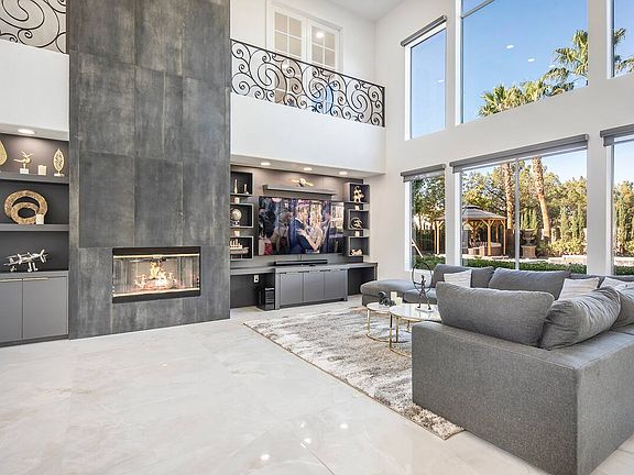 Fully furnished luxury offering a rare level of quality & design, stunning corner property has no side or front neighbors sits minutes from the Las Vegas Strip, airport, parks, shopping, top conveniences. The grand entrance features dual staircases, a private movie theater on one side, and a poker room on the other. Floor to ceiling windows frame the backyard bring natural light into the main living areas. The chef kitchen features top tier appliances & a sleek modern layout. The first floor includes a full bedroom suite plus a complete gym with a dry sauna and shower. The backyard is built for luxury living with a large lap pool that heats, a side yard with a basketball court, plenty of space to relax or entertain. Upstairs includes a pool table loft, multiple guest rooms, a primary suite with a balcony overlooking the park. The second balcony with glass railing overlooks the pool area. A move in rare opportunity for a high end lifestyle in an incredible location.
