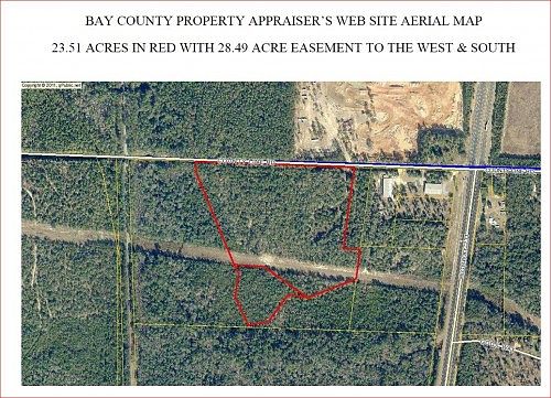 Complete info: http://countylinerd.AgentMarketing.com - * BANK OWNED FORECLOSURE * THIS 23 ACRES IS LOCATED JUST 800 FEET OFF HWY 231 AND LOCATED ON A PAVED ROAD WITH over 1200 FEET OF FRONTAGE. (**There is a 29 acre conservation district next to this so no one can ever build on it) The subject consists of a potential 3.45 acre conservation easement on the rear. The remaining 20.06 acres consist of unencumbered uplands. Acreage estimates were taken from the Bay County Property Appraisers Web Site because a current survey on the property was not available. The property is located approximately 800' west of Highway 231 on the south side of County Line Road. The property has a gradual slope from County Line Road to the south. The 20.06 acres are covered with trees and underbrush and appear to be high and dry. There is an estimated 100' gas line easement that traverses the parcel in an east-west direction. Buyer to confirm all information if important. sold As Is Priced Firm. Buyer pays title seller will only pay Doc Stamps. Taxes are less than $300 a year for the total tract of land.