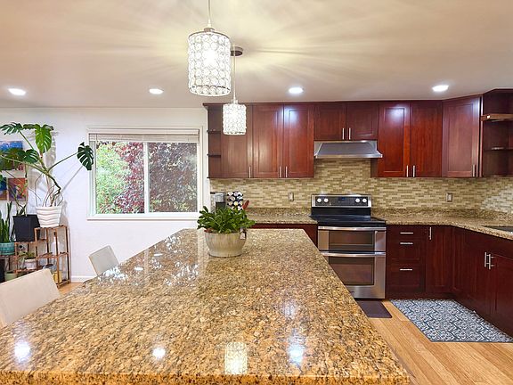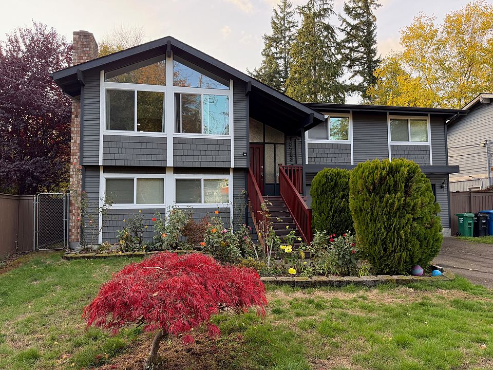 Beautifully updated and sunshine filled home on private quiet road with open floor plan. Classic mid century modern with vaulted ceilings in main living area, open modern kitchen w/ tons of cabinets and quartz island. Large deck off dining room for easy entertaining and enjoyment. Floor to ceiling windows in living area brings in incredible natural light and views. Truly a wonderful home boasting so much space and comfortable floor plan. Split level home has 2 levels of living spaces. Bonus huge recreation room in basement and extra office room too. Large 2 car garage with charging area for electric cars. 4 bedrooms and 3 full baths. Fenced back yard with country-like yard and room for gardening. Dont miss this amazing home new to market. Pets case by case, good credit and available Dec 21.