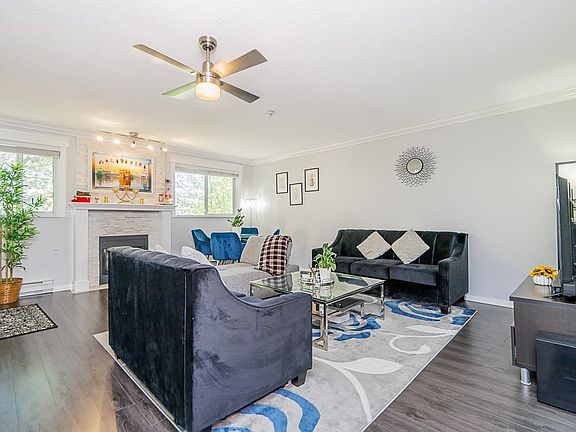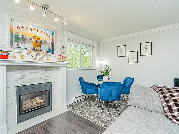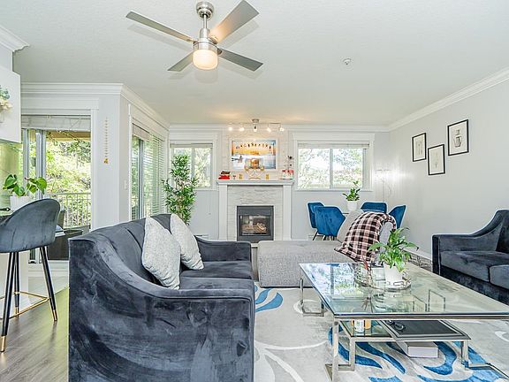 Beautiful and spacious upper corner unit with views of the treed & manicured courtyard this lovely private and updated condo is a must see! Every room has been updated with exquisite detail from the flooring, to the granite countertops, stainless steel appliances, custom blinds & screens, crown moulding, updated lighting & gorgeous stone fireplace. 2 bed/2 full baths. Primary bdrm features a 4-piece ensuite & large walk-in closet. 3 sets of sliding glass doors lead to an expansive covered & wrap-around patio perfect for sunrise coffee! Proactive strata. Newer roof, gas hotwater boilers & healthy contingency plus a social lounge & exercise centre. Steps to shopping, transportation & restaurants. 2 secure parking & 1 storage included. Pets/rentals allowed with rest. Call for private viewing!