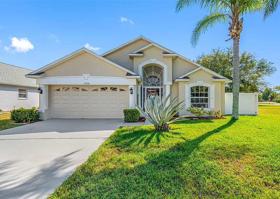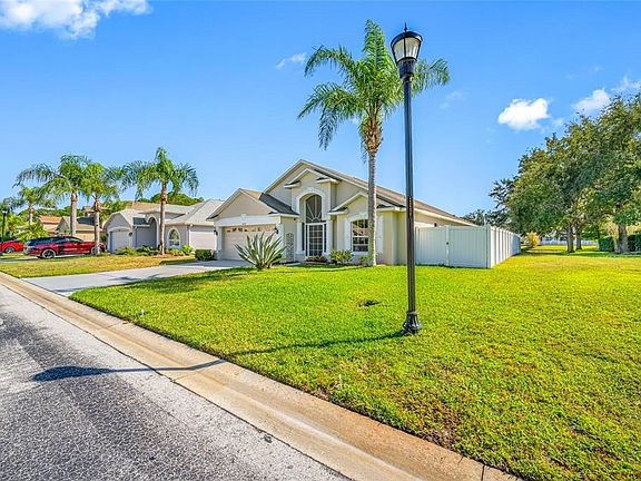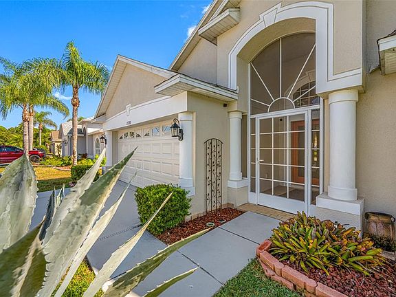 What stunning views await in the Verandahs Community! The seller is generously offering a $10,000 credit at closing to use as the buyer would like! This four-bedroom, three-bathroom home is sure to impress from the moment you arrive. Curb appeal at its finest, with lush landscaping and a spacious green expanse that sets the stage for what’s inside. Step through the front door to be greeted by soaring high ceilings, an abundance of natural light, and gorgeous wood-look flooring that flows seamlessly throughout. The open-concept living space offers uninterrupted sightlines from the entry all the way to the back patio, where serene pond and wooded views create a tranquil backdrop. The well-equipped kitchen boasts stainless steel appliances, an abundance of cabinet space, sleek granite counters, and a cozy eat-in breakfast nook, perfect for casual meals or morning coffee. A formal dining space is just off the living room and if you prefer not to have a formal dining space, this can also be used as home office or a bonus room. A smart split floor plan ensures privacy, with the primary suite tucked at the rear of the home. This luxurious retreat features a spacious walk-in closet and an en-suite bathroom complete with dual sinks, a relaxing garden soaking tub, a walk-in shower, and a private water closet. The three additional guest bedrooms are thoughtfully appointed throughout the home. Two share a convenient Jack-and-Jill bathroom, while the front bedroom enjoys easy access to a nearby third bath. Step outside to the extended screened enclosure in the backyard, an ideal spot for peaceful mornings and evenings as you soak in the views and perhaps spot a graceful bird, deer, or turtle wandering by. This home has been thoughtfully updated with a brand-new hot water heater, a new AC system installed in 2021, and window tint added in 2020 for enhanced comfort and efficiency. Nestled in the quiet, private, gated community of Verandahs, residents enjoy a sparkling community pool, a clubhouse with fitness center and gathering spaces, preserved nature areas with walking trails, a playground, and an unbeatable neighborhood vibe. Conveniently located just off the Suncoast Parkway in Hudson, it’s a short, easy commute to most of Tampa, this the perfect blend of serenity and accessibility!