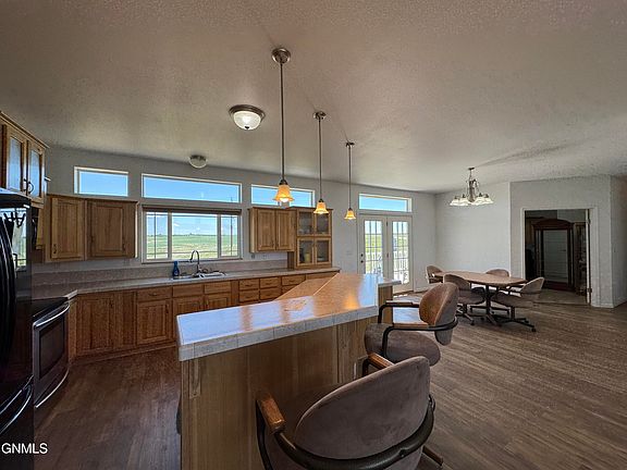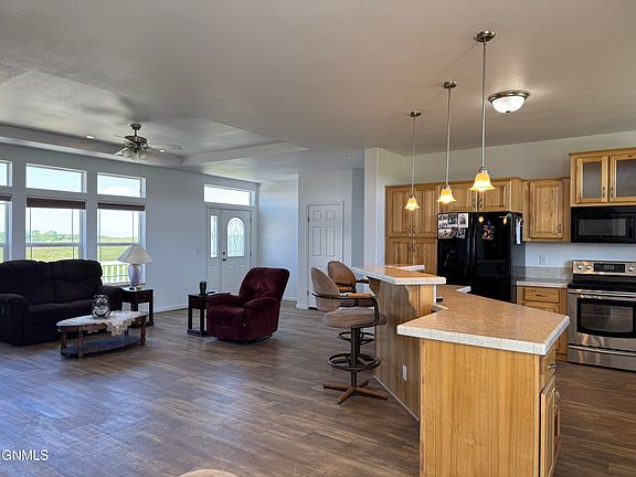 Country Living! Check out this fabulous 5 bed, 3 bath 4,144 SQFT home located on 6 acres with amazing country views! On the main floor you will find a spacious open concept kitchen/dining/living room with several windows for tons of natural light. The primary suite is huge with a soaker tub, separate shower, toilet closet, and double sinks. Also on the main floor are 2 additional bedrooms, 1 additional bathroom, an office with a built in desk and cabinets, and a large mudroom/laundry room. Downstairs you will find a large open living room with a walk out sliding glass door, 2 more bedrooms a bathroom and lots of space to use as storage or finish off as you please. The attached 3 stall, 1,800 SQFT garage provides ample space for storing all of your toys or working on projects. Outside you will find a large deck off the dining room perfect for relaxing and enjoying the beautiful North Dakota sunsets and a second deck off the living room! There is a large garden space next to a nice garden shed. This property won't last long, schedule your showing today!