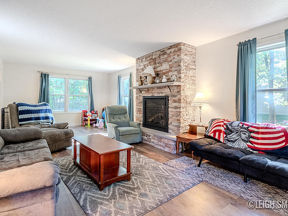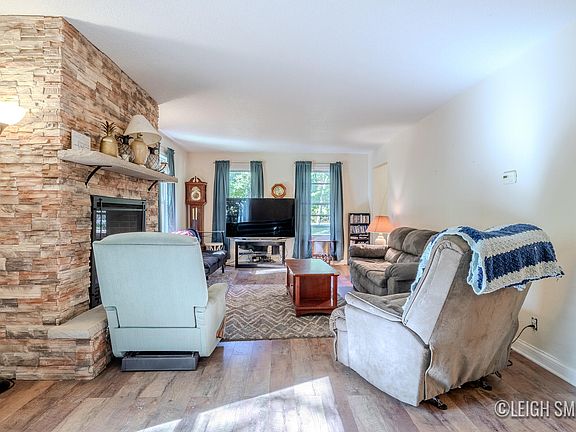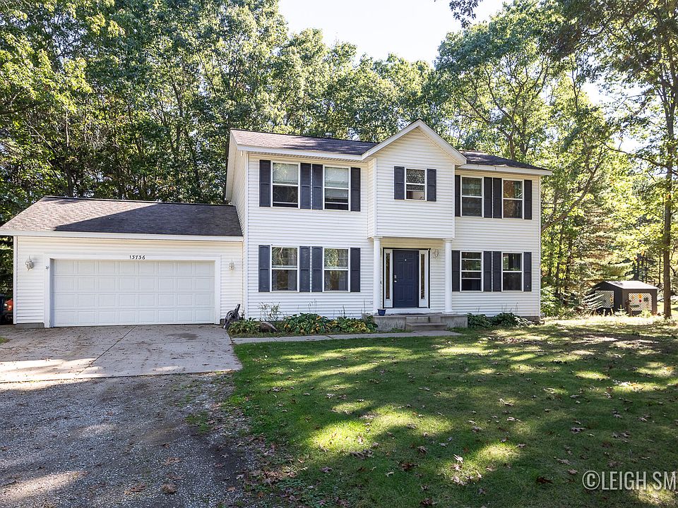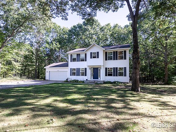 This large and stately home, built in 2005, just down the road from the banks of the Grand River has so much to offer. Setback in the woods, there is plenty of room for everyone and everything, both inside and out. A large kitchen with space for a kitchen table, the option for a separate formal dining room, large main floor living room with stylish stone gas log fireplace, a second large living room in the walkout basement, 4 bedrooms upstairs with a primary ensuite and walk-in closet, and a 5th bedroom in the walkout basement. Outside the front yard is large and open while the backyard offers plenty of shade and privacy to enjoy BBQ'ing and hanging out on the large deck, or even a nice bonfire. Public access and boat launch to the Grand River is just down the street, and the 231 Bypass offers quick access to I96. This may be exactly what you've been looking for, schedule your showing today.