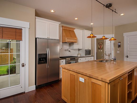 Timeless masterpiece featuring soaring ceilings & dramatic stone fireplace withcustom built in entertainment center. Stunning hardwood floors, gourmetkitchen, large walk in pantry, stainless steel appliances, large walk in pantry, butcher block island, wine fridge and breakfast nook. Elegant but inviting 3,009 square foot home. Main floor master suite withlarge shower, claw soaking tub and walk in closet. Formal dining room, private den/office and great room, open staircase, southern exposure, lots of windows. Upper levels features 3 spacious bedrooms and large bath with double sinks. Air conditioned, custom blinds with auto remote in great room, whole house fan, lotsof storage on both levels and garage has pull down ladder to attic storage. No stairs from garage to large laundry room. Two patios with one covered to enjoy the professionally landscaped yard with sprinkler system. Gutter dome system on lower level of home. Attention to every detail was thought of in this upscaleappointed home. This home is sure to please any buyer.