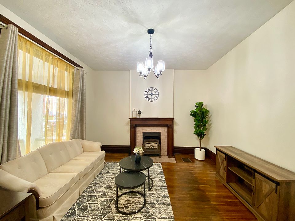 Large front porch perfect. Washer/dryer in the basemen. Off street parking with permit.