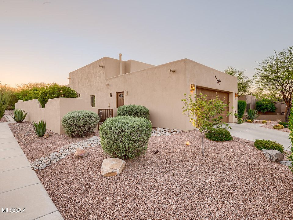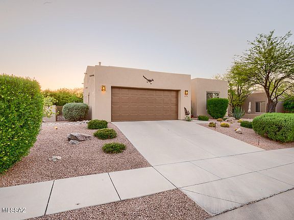 Welcome to this stunning 3 bed, 2.5 bath corner lot property that is situated right off the 2nd fairway in the highly sought-after and gated Quail Hollow at Star Pass subdivision. Upon entering the home, you'll be greeted by the impressive 12 ft ceilings and a spacious great room complete with a cozy gas log fireplace, perfect for relaxing with family and friends. The kitchen is a chef's dream, boasting a large island, Corian countertops, and stainless steel appliances. This home's split bedroom plan ensures privacy, and the primary suite is a true oasis with a dual vanity, shower/tub, and low-flow showerhead. This home has been recently painted and the addition of a brand new hot water heater makes it move-in ready. Step outside into the exceptional backyard, where you'll be captivated by the stunning views of Tucson Mtn Park. The extended flagstone patio features a built-in BBQ, kiva wood burning fireplace, and outdoor kitchen, making it an ideal space for entertaining or relaxing. This is a rare opportunity to own a beautiful home in the highly desirable Quail Hollow at Star Pass subdivision, and with its excellent location and exceptional features, it won't be available for long.