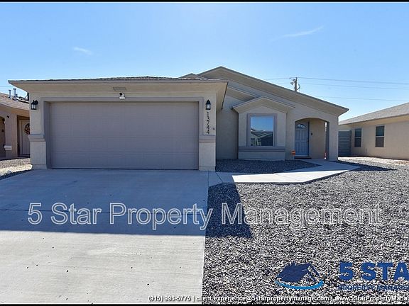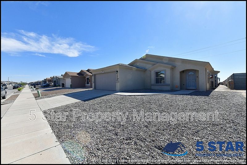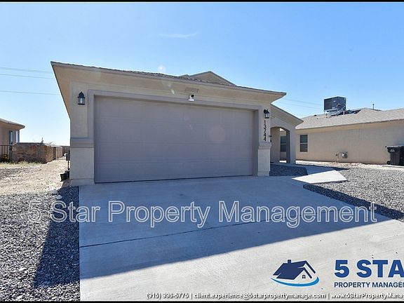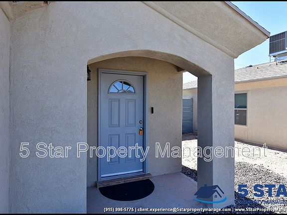 Elegant 4 bed, 2 bath. A stucco facade, desert-friendly landscape, and two-car garage set a clean, modern tone before an airy great room unfolds with tile flooring and a sleek ceiling fan. The kitchen pairs granite counters with white shaker cabinetry, subway tile, and stainless appliancesincluding a gas rangeframed by a curved dining nook lined with tall windows and a contemporary chandelier. The serene primary suite adds plush carpet, a walk-in closet with built-ins, and a bath featuring dual granite vanities and a glass-enclosed tiled shower. Three additional bedrooms provide flexibility for restful retreats or a quiet workspace. A covered patio opens to a walled, low-maintenance backyard ready for outdoor living. Near Horizon Town Center and Eastlake Marketplace, with regional favorites like the El Paso Museum of Art and Scenic Drive Overlook within an easy outing. Refrigerated air and dedicated laundry area add comfort. Deposit-Free Renting service to Obligo qualified renters, fees may apply.
