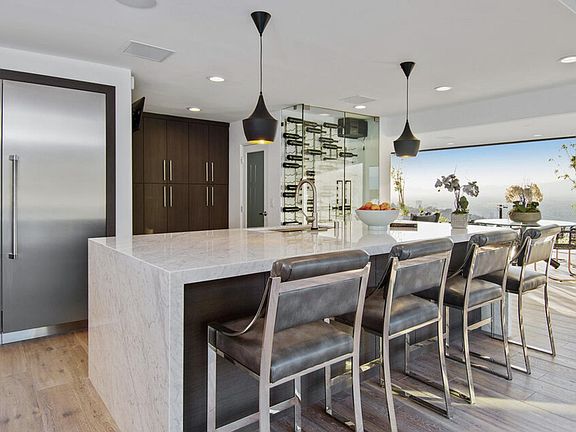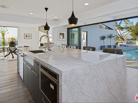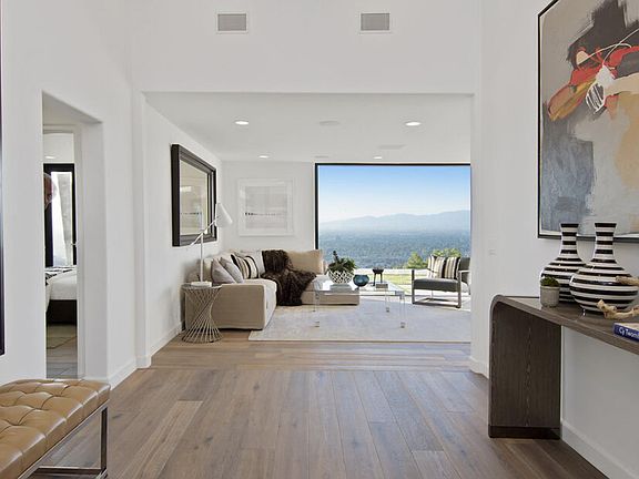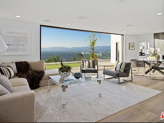 Wonderful opportunity to lease this very private modern compound with explosive 180 degree views on approximately 4 acres. Gated private driveway leads to resort like grounds on a picturesque setting overlooking city lights, canyon and mountain views. Home has been newly remodeled with high ceiling entry, hardwood floors throughout, fold away doors, open floorplan and views from every room. Chef's kitchen with marble waterfall counters, top of line appliances and walk-in pantry plus wine wall. Two primary suites with luxurious bathrooms, stone and marble finishes, walk in closets and jaw dropping views. 2 bedroom/1 bathroom detached guest house can be home office, gym or guest quarters. 3 en-suite bedrooms in the main house. Newly renovated pool, outdoor firepit, bbq center and huge deck for entertaining. Plenty of room for outdoor gatherings with expansive grassy areas and mature trees. Double gates for security, 2 car attached garage and parking for 10+ cars. Incredible Mulholland corridor location easy access to Beverly Hills, SF Valley and 405 Fwy.