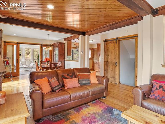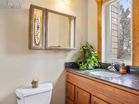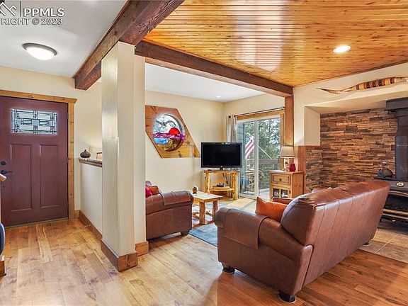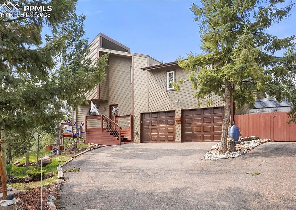 THE TOP OF THE WORLD is the best description of this spectacular home that is just as good on the outside as it is on the inside. Let’s talk views…city, mountain, and forest w/ the two upper bedrooms having private balconies w/ Rampart Range views. The Primary floor has a private balcony; the living room, dining, sunroom, kitchen & basement family room all have walkout decks/balconies with updated cable railings to enhance the views. The Primary floor offers a sitting area, pellet stove, walk in closet, and garden bay window with two skylights that emit tons of natural light. The Primary floor also includes a 3/4 bath with walk in shower. The Primary floor has been used as a Great room, i.e., the floor plan is flexible as built. The upper level has 3 bedrooms and a 5-piece bath w/ a large soaking tub/shower combo. The largest upper bedroom includes a gas fireplace, balcony, custom-built walk-in closet, with 12’ ceilings and ample shelving. The smaller of the bedrooms on the upper level is currently serving as an office. Upgraded finishes are throughout the home including newer Pella windows, custom interior /exterior doors, sliders, paint both interior/exterior, new insulated garage doors, hardwood flooring, granite counters, newer roof & forced air furnace. The mud room is to die for w/ plenty of room for laundry, freezers, sink and storage galore! Mudroom has access to the kitchen, garage & outside gardens. The main level has living, dining, kitchen and ½ bath. Bonus is the main level sunroom, full of natural light from walls of windows that includes a built-in hot tub. The recently remodeled basement level is a flex space, with a beautiful wall fireplace, ½ bath plumbed for a future shower, tons of storage, walkout to the private, fenced back yard. Home has an asphalt 3 car driveway, fenced dog run, fire pit, mature perennial gardens, double gate to back, and fiber optic close. This home and all it contains, rounds out to perfection!