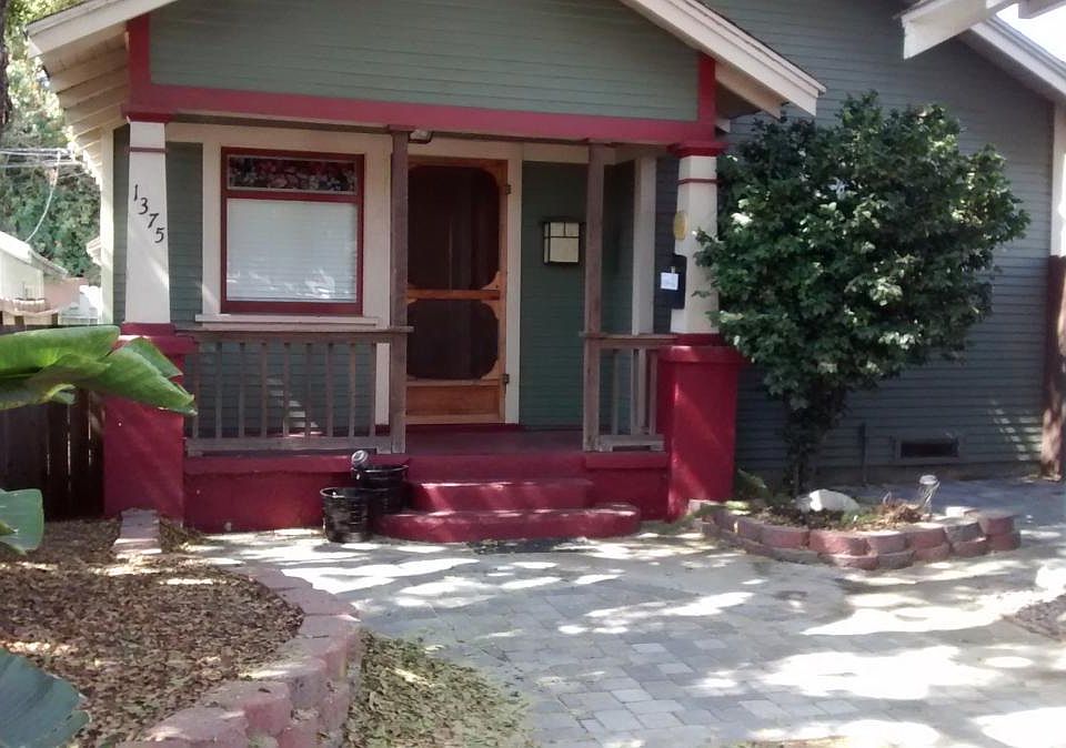 The opposite of apartment living! Lovely 1-bedroom back house with loads of Craftsman charm. Shady front yard with giant trees and brick patio. Fenced back yard needs some tlc--green thumbs and outdoor decorating ideas welcome. Very private house set far back from the street on a large, woodsy lot (there is a front house that has a separate fenced yard). Quiet, low-density street makes parking pretty manageable. Features: Stainless steel stove and refrigerator. New washer/dryer in unit. Ceiling fan. Original built-ins. Front porch has room for a bistro table. Storage garage (not for parking). Small dog/cat door recently installed.