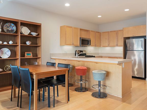 Modern downtown living at The Tate! This 5th-floor residence offers an efficient contemporary layout with upscale finishes and secure condominium living in the heart of Eugene. Large windows showcase westerly city views, paired with an open kitchen design featuring quartz countertops, stainless steel appliances, modern cabinetry, and an eat-in island ideal for everyday living. Primary bedroom has a Murphey-style bed that converts to a desk for a private WFH space.Additional amenities include in-unit laundry, heating and cooling for energy-efficient comfort, and controlled building access. The Tate provides elevator service, secure entry, bike storage, and a walkable lifestyle with immediate access to downtown dining, shopping, farmers markets, transit, and the UO campus.Unit 503 comes with a secured parking space under the building as well as additional storage unit. The Tate is the epitome of downtown living in style!