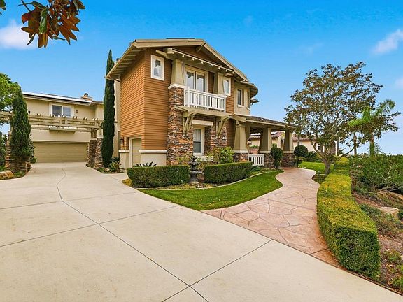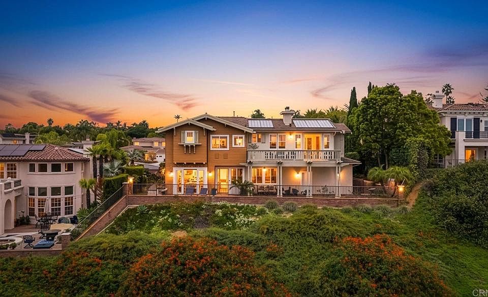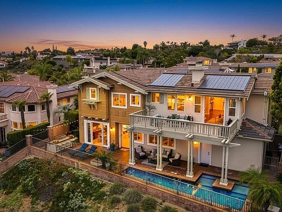 Bathed in golden coastal light and cooled by ocean breezes, this west facing Quail Ridge home offers a daily connection to beauty, tranquility, and elegance. From its elevated position overlooking the 5th and 6th holes of Encinitas Ranch Golf Course to the endless blue of the shimmering Pacific, life here feels intentional and unhurried. A marble entry welcomes you at the front door, while a peaceful courtyard offers a secondary entrance into light filled interiors where quality finishes, custom craftsmanship, rich hardwood floors, and a dramatic formal living room with soaring ceilings create a sense of timeless sophistication. The heart of the home unfolds toward the view, where the family room and chef’s kitchen are designed for both lively gatherings and quiet mornings, anchored by an extended island, six burner gas range, double ovens, butler’s pantry, and casual dining with ocean and fairway vistas. Indoor and outdoor living blends seamlessly as fires glow, wine is poured from the dedicated wine room, and the backyard becomes a private retreat with a water feature pool and spa, built-in grill, and expansive spaces to linger as the sun melts into the horizon. Upstairs, the primary retreat feels like a sanctuary, where mornings begin on a balcony with picturesque views and evenings unwind in a spa inspired bath with dual walk-in closets and a serene sitting area with a cozy fireplace. Three additional bedrooms upstairs and a flexible den with potential for a fifth bedroom downstairs offer space to host, create, and recharge, while thoughtful upgrades including a new roof (2023), owned solar, EV charger, and a workout room quietly elevate everyday living. Dual garages for three vehicles and an extended driveway provide ample parking. Beyond the gates, Encinitas unfolds with scenic preserve trails, world class golf, golden beaches, Botanic Gardens, Fox Point Farms, and a vibrant dining and shopping scene, creating an exceptional coastal lifestyle.