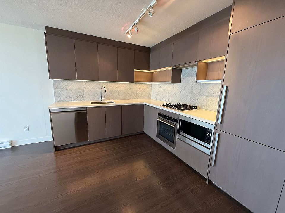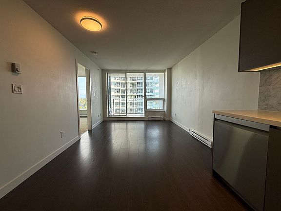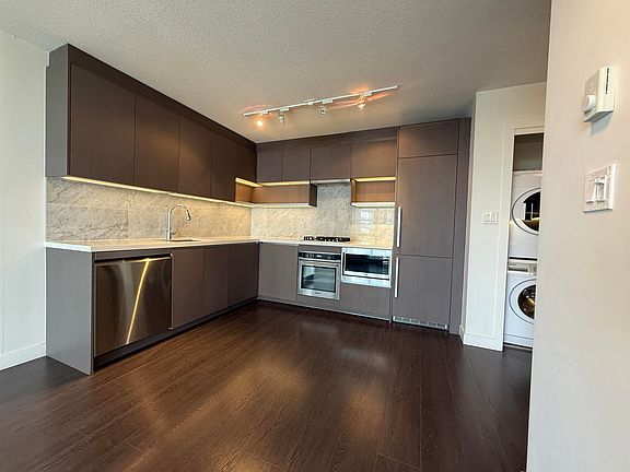 Welcome to Park Avenue East, ideally situated in the heart of Surrey Central. This contemporary one-bedroom, one-bathroom open-concept condominium offers an elevated urban lifestyle with notable features such as laminate flooring, over-height ceilings, and expansive full-height windows that provide abundant natural light. The modern kitchen is equipped with integrated stainless-steel appliances, including a gas cooktop, and engineered quartz countertops. In-suite laundry is also included for added convenience. Residents have exclusive access to an array of resort-style amenities, including 24/7 concierge service, a social lounge with dining area and kitchen, theatre, golf simulator, putting green, tennis court, fitness centre, yoga studio, sauna and steam room, hot tub, outdoor pool, etc.