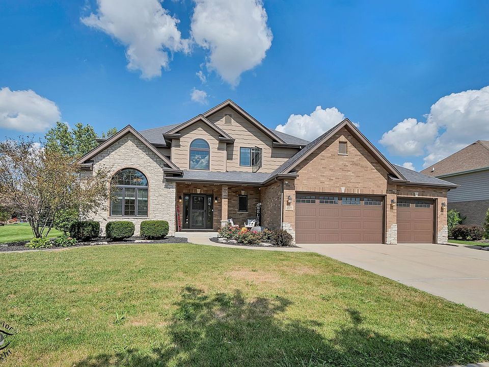 Located in the highly desirable Sunset Lakes Subdivision, this stunning 4-bedroom, 4-bath custom-built 2-story home offers the perfect blend of elegant interior finishes and exceptional outdoor living-highlighted by a private backyard oasis! Designed with quality and comfort in mind, the main floor features hardwood flooring, 9-foot ceilings, detailed millwork, and crown molding throughout. The layout includes a formal living room, a private study, and a family room with a fireplace, perfect for both everyday living and entertaining. The kitchen is a true centerpiece, showcasing granite countertops, Amish-built maple cabinets, and a full suite of stainless steel appliances. Upstairs, a loft/sitting area provides additional flexible space. The primary suite includes a luxurious walk-in shower with seat, separate bathtub, double sinks, and ample closet space. Three additional large bedrooms offer generous storage and share a well-appointed full bathroom. The finished basement expands the living area with LVT plank flooring, a custom bar area with wet sink, eating space, recreation zone, and workout area-perfect for entertaining or relaxing. Step outside to your private backyard oasis featuring an inground pool, gazebo, and a large storage shed. Whether you're hosting summer gatherings or enjoying a quiet evening swim, this outdoor retreat is truly a standout feature. A sprinkler system keeps the grounds lush and green with minimal maintenance, ensuring your landscaping looks its best all season long. The spacious 3-car garage offers plenty of room for vehicles, tools, and additional storage needs and a NEW tankless water heater adds energy efficiency to this well-maintained home. This property combines timeless craftsmanship with modern amenities in one of the area's most sought-after communities....Don't miss this one!
