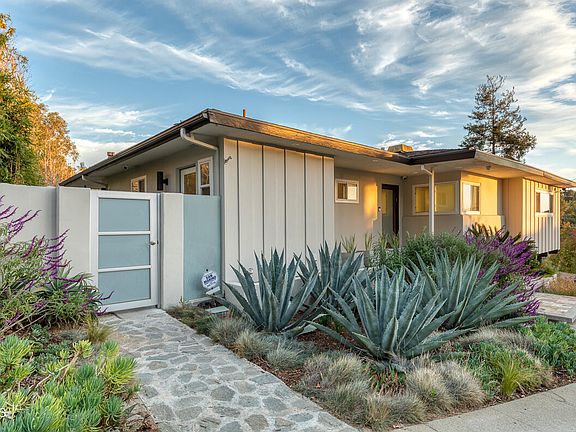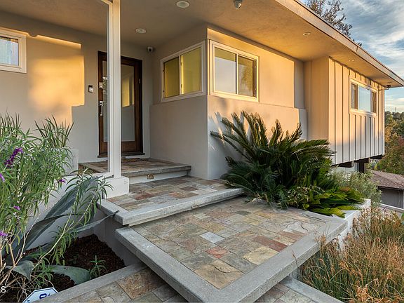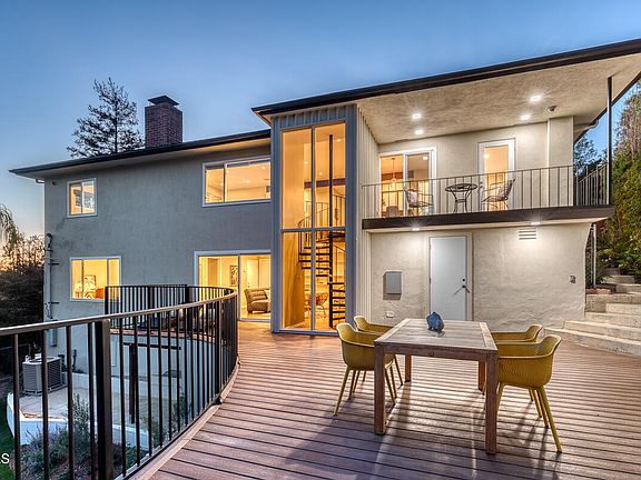Thoughtfully re-imagined, this San Rafael Hills contemporary residence offers a sleek twist on its original 1950s mid-century design. Swanky and sophisticated, the home's split-level configuration provides versatile living options. The entry level offers an open concept with contiguous living/dining and kitchen space, a striking corner fireplace, a wall of windows and access to a balcony all overlooking the grassy backyard and surrounding hilltops. The kitchen has just undergone a renovation with new tile backsplash, granite countertops, breakfast bar and new appliances. Two generous bedrooms, one with an enviable over-sized walk-in closet, two recently remodeled baths and a separate laundry room complete this floor. A spiral staircase leads to the lower level consisting of another flexible space which currently serves as a generous great room featuring a built-in bar and wall of bookshelves. Slider doors access the beautiful new expansive deck and gentle steps to the back gardens. An attached study with fireplace, additional bath, workshop and exit to the 2 car garage ensure this space will be both accessible and well- utilized! This home is an entertainer's dream! With its prime location and easy access to Old Town Pasadena, the iconic Rose Bowl, Arroyo Seco and downtown Los Angeles, this one impresses on many levels.
