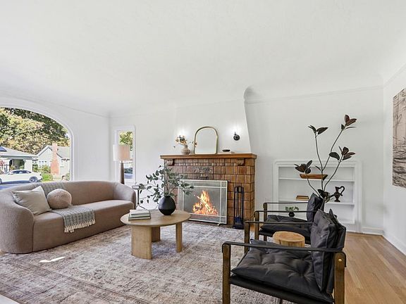 Spanish revivalClassic tiled fireplaceNew light fixturesBrick front porchNatural lightQuartz countertopsDining room