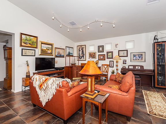 This beautiful 3+2 home is waiting for new owners. Front Porch Golf Views, Upgraded Tile Flooring, Granite Kitchen Counters, Cherry Cabinets with pull outs, extra drawers and glass display cabinet in kitchen. Plantation Shutters, GE Profile Appliances, Custom Interior Lighting.50 AMP 220V Circuit in Garage. Insulation in Garage attic and thermostatically controlled louvered exhaust fan setup in the gable to draw out heat. Rear motion detector lights. Beautifully landscaped. New Exterior Paint and AC in 2018. This is a must see.