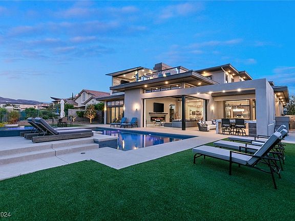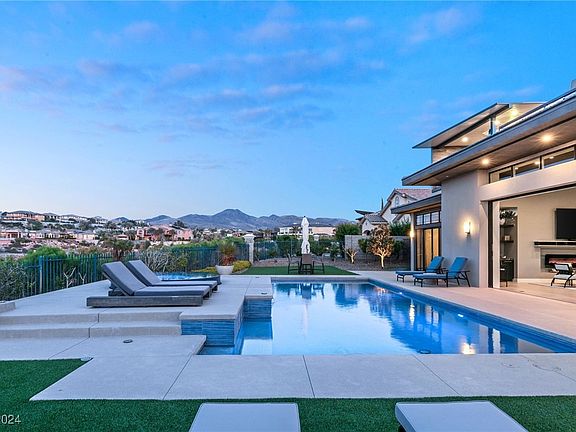 Custom opulence in Seven Hills on Rio Secco's 17th fairway with Strip views! Featuring over 7,300 of indoor living space with an additional 1,500 square feet of outdoor entertaining space, this custom home offers 5 bedrooms, 7 bathrooms with 2 lofts. Upon entry, you're greeted by custom woodwork and formal entry. The expansive great room has true indoor/outdoor living with two pocket doors opening to custom BBQ, entertainment space. Massive kitchen with Wolf appliances, custom, built-in table in breakfast nook. Downstairs primary bedroom with access to backyard. Custom tequila room off formal dining room. All bedrooms with walk-in closets and ensuite bathrooms. Custom viewing deck off loft with views of golf course and strip views! Home also features 2 commercial grade looped water heaters.