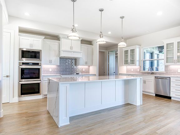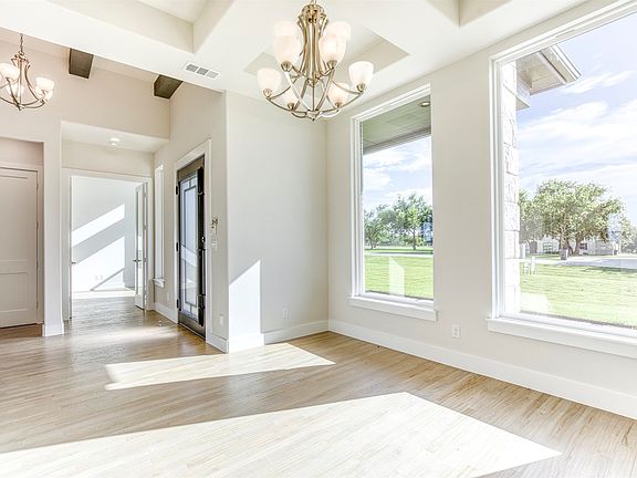 This stunning custom-built home presents a striking blend of modern elegance and timeless Texas charm. The contemporary black iron front door with glass insets creates a sophisticated entrance that hints at the high-end finishes found inside. The elegant dining room offers the perfect setting for both intimate dinners and festive gatherings. A coffered ceiling adds architectural drama and depth. Vaulted ceilings with exposed wood beams in the living area add character and a sense of grandeur. The kitchen is a showpiece of thoughtful design and timeless elegance, offering both beauty and functionality for the modern homeowner. Anchored by a massive waterfall-edge island, the space provides ample room for meal prep, casual dining, and entertaining. Double Ovens, glass cabinets, pendant lighting and an undermount sink with a beautiful backyard view are just a few highlights in this kitchen. The primary ensuite bath offers a large shower space and separate soaking tub along with separate vanities. The primary closet has two sets of built ins and 3 levels for hanging clothing. The laundry room offers additional storage with multiple cabinets. Come see this home today and all that it has to offer!