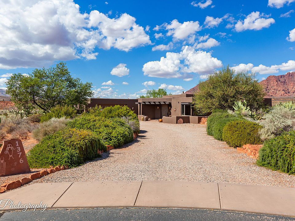 Welcome to 1376 Talachiro. Masterfully sited for inspirational views, seclusion and privacy. A generous .81-acre view lot with lush outdoor living areas and mature landscaping. Well-appointed 3-Bed, 2-Bath home with dedicated Den/Office, and flexible third bedroom used currently as a craft/studio space. A well cared for and deeply loved original owner, this Kayenta custom build offers many extras. Colorful, classic southwestern Pueblo style with abundant natural light and easy access one-level home features a walk-in closet in every bedroom, a huge walk-in pantry, functional large laundry room and a fantastic heated/cooled workshop off the spacious garage. Form and function with a seamless indoor/outdoor footprint, 1376 is a treasured haven for those seeking the road less traveled. 1376 offers an exceptional experience, boasting its proximity to the Kayenta Art Village galleries, the Center For The Arts, Xetava Cafe & Rusted Cactus bar/grill, and unrivaled access to southern Utah's renowned recreational opportunities: Gunlock State Park and reservoir, Dixie National Forest, and Pine Valley alpine recreation area. Embrace the best of life against the stunning backdrop of Kayenta's inspiring red rock cliffs with waterfalls after a desert downpour, overlooking the sprawling 6,000-acre Santa Clara River Reserve. Whether you're stargazing under the night sky or enjoying the "blue view" of Utah's West Mountain, Arizona's Beaver Dam Wash National Conservation Area, the nearby Joshua Tree National Natural Landmark, and countless other wonders await your discovery.