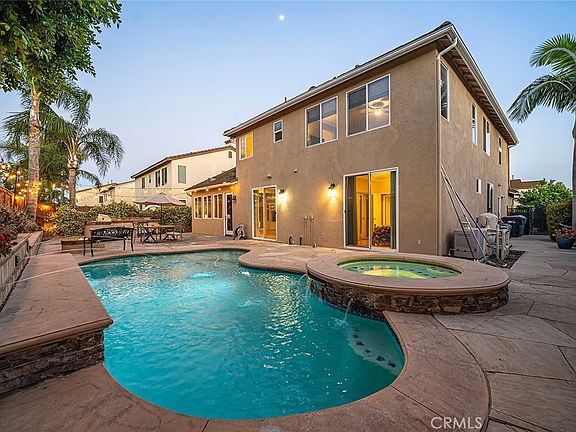 The backyard creates a staycation experience with a custom pool and spa that includes water features, a flagstone deck, fire pit, and a built in BBQ island including a new BBQ and beverage fridge.