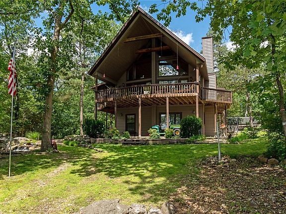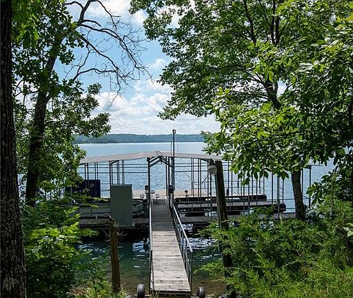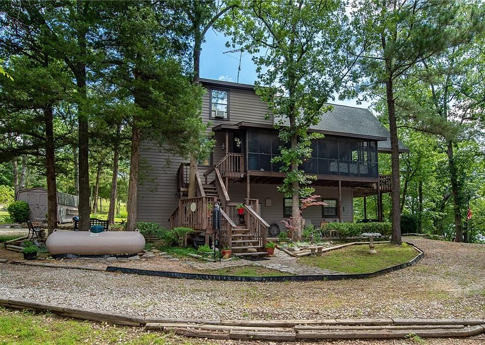 You'll find (2) 10'X24' Slips, semi-secluded, lake front 3 bed, 2 full bath and 2 half bath home in a wonderful community in Garfield, AR! Enjoy amenities such as gas log fireplace, cathedral ceilings, tons of natural light and 2 car garage! Inside, this home boasts an excellent layout with an open floorpan, large windows and ceiling fans and spacious rooms throughout the main living, kitchen and dining area. Kitchen has an abundance of cabinets space, pantry storage, and eat-in area with a 4 person bar. Living room/kitchen area walks out to an enclosed sunroom and deck. Main floor master bedroom with master bathroom on suite and double vanity. Laundry room off the kitchen with washer/dryer hook ups. All bedrooms are carpet. Outside the home, you'll enjoy a large deck and great views of Beaver Lake. Enjoy the easy walk to the shared 4 slip boat dock with a large swim deck directly in front of the home and a detached 160 sq ft outbuilding for additional storage. You won't want to miss this amazing home!