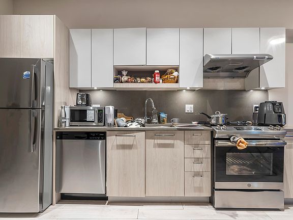 Modern kitchenWood-grain cabinetryChrome hardwareSoft-close drawersLaminate hardwood flooringRooftop deck with bbqsLush seating areas