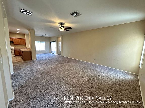 Welcome to this inviting single-family home offering a spacious open-concept layout with the formal living area seamlessly flows into the dining space and kitchen, creating a bright and sunny living space. An enclosed den just off the living room provides the ideal space for a home office. The kitchen comes equipped with stainless steel fridge, plenty of cabinet and counter space, recessed lighting, a breakfast bar to pass through the dining area and a convenient pantry for extra storage. Enjoy the privacy of a split floor plan the primary suite features a walk-in closet and a private bath with dual sinks and a linen closet. The two additional bedrooms share a full hall bath and an extra linen closet. Additional highlights include a custom tan paint, dedicated laundry room with washer and dryer hookups, 2 car garage and a covered patio with ample backyard space. Pet-friendly for up to 2 spayed/neutered pets with a $550 fee per pet.