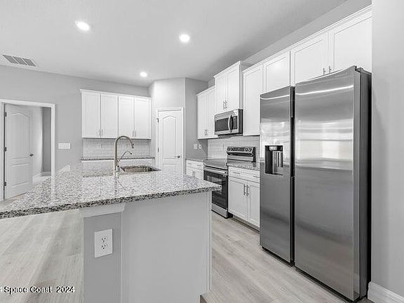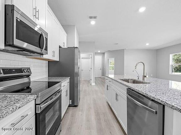 This modern home in Palm Bay boasts four spacious bedrooms and three sleek bathrooms, designed for comfort and style. The exterior features a clean, minimalist design with large windows, offering plenty of natural light. Inside, the open-concept living area flows seamlessly with Movhawk revwood floors into a oversized kitchen equipped with high-end stainless steel appliances, granite countertops, and a large island. The master suite includes a luxurious ensuite bathroom with a walk-in shower, his and her closets, and double sinks. Each additional bedroom offers ample space, with a sense of comfort. A two-car garage and modern finishes throughout add to the appeal of this beautiful Palm Bay residence. Close to Bayside Lakes and local shopping. Lawn care is included.