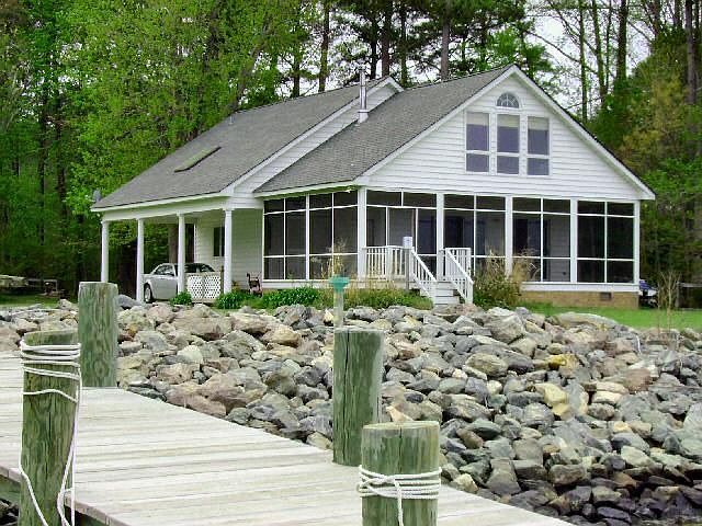 Spectacular views of the Chesapeake Bay, protected shoreline. Cuatom home with waterside screened porch, great room with wood stove, cozy kitchen open to great room and views, master bedroom and bath on main level powder room laudry and workshop room. Second level has waterside balcony office area, two bedrooms, bath and loads of storage. Covered portico for car and shed. Incredible Price!!