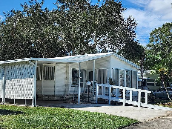 Beautifully maintained, move in ready 2 bedroom/2 bath manufactured home (1995 Palm Harbor) for sale in Indian Oaks Manufacturing Home Park, an Over 55 Community!!! Whether you're planning on making Florida your permanent home or a winter getaway this is the home for you! The floor plan includes a front porch; glassed in air conditioned sun room with double pane windows; spacious living room; dining room with built in cabinet; kitchen with movable island, dishwasher, refrigerator with ice maker, glass top stove, microwave, and lots of cabinets; main hall has display shelving and built in cupboards; master bedroom has a walk-in closets and built in cabinets for storage; master en suite bathroom has a large walk-in shower and ADA toilet; second full bathroom has additional cupboards; laundry room is off of the main hall. Home features TPO membrane roof with 2" rigid insulation (August 2017) for lower utility bills; laminate wood flooring; AC was replaced in 2018; cement block skirting; laminate flooring Aug 2017; attached carport; insulated storage shed with a workbench. Dishwasher and disposal new in 2017. Complete plumbing replacement including new hot water heater in 2018. Aluminum hurricane shutters with clear polycarbinate panels in sunroom and kitchen to allow light to enter installed 2024. Home is wired for whole house generator hookup. Home is being sold with all of its existing appliances. The home is a steal at $99,900! Current monthly lot rent is approximately $799.00, and then will go to market rate of $912.00 for new buyers January 1, 2026. Park approval is required for purchase. Lot rent includes basic lawn care (mowing, edging, trimming & clearing of clippings), as well as the use of all of the community facilities including the clubhouse, heated swimming pool, shuffle board, horseshoe pits, library, exercise room, game room, double kitchen, banquet room, two large ponds, and a fenced storage area for free storage of residents RV's, boats, etc. (based on space available). The active voluntary HOA in the park (dues $30 a year) plan, sponsor and operate a full slate of social activities including weekly bingo, poker, mah-jong, and dominoes. The development hosts resident birthday parties, holiday parties, arts & crafts, cookouts and covered dish events. Indian Oaks is pet friendly as long as they are 25 lbs. or under when fully matured. Indian Oaks Mfg. Home Park is conveniently located to shopping area, golf courses, zoo, hospital, churches and doctor's offices. Rockledge is 40 minutes from Orlando Airport, 60 minutes from Daytona, less than 30 minutes from Cocoa Beach.