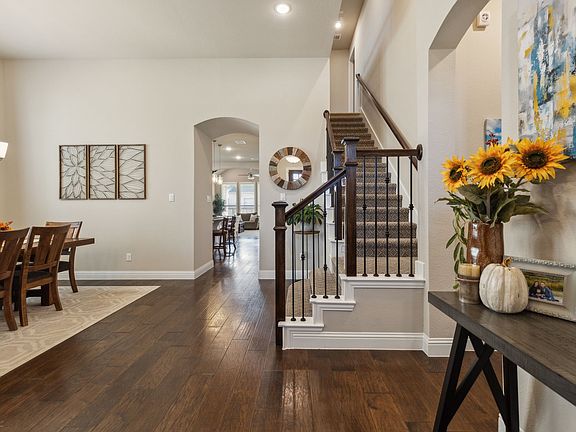 Beautifully appointed Highland home in highly sought after Prosper ISD. Home features engineered hardwood floors, plantation shutters, open floor plan with 2 dining areas & office allowing for plenty of space for your needs. Living room features stone fireplace, beamed ceilings & opens up to patio or to the breakfast & kitchen areas. Kitchen features planning center or butler's pantry, stainless steel appliances, white cabinets with designer backsplash & lighting, pantry & large island. Primary suite is spacious with seating area & spa like bath featuring walk-in shower, soaking tub, dual vanities & walk-in closets. Two additional bedrooms, a full bath & powder bath on the main level. Upstairs find a large game room & powder bath! Covered patio & spacious back yard, 2 car garage. Beautiful curb appeal!