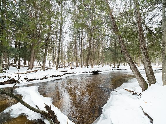 3 acres of woods , water and sunny areas surround this high quality ''Up North'' home. 203 ft of frontage on both sides of sizable Cedar Creek where Steelhead run in the Spring and Salmon spawn in the fall! Even rainbow and brook trout! Open floor plan & many impressive, unique features including tongue & groove knotty pine walls, whitewashed wood ceilings and floors, corrugated steel ceiling, wood stove and bar in family room, stainless steel appliances and quartz countertops, PLUS 2x6 construction, Generac generator, natural gas, tankless water heater, newer metal roof and 32x40 pole barn for garage and storage. 30ft screened porch on house plus screened gazebo creek side.