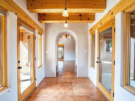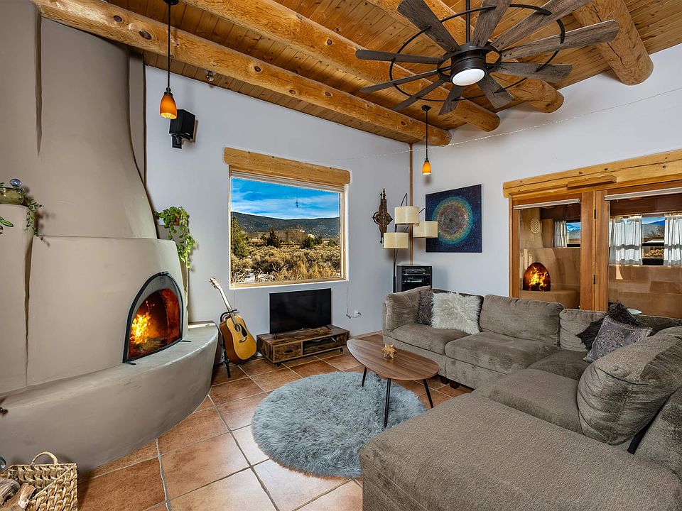 Beautiful, bright, turnkey single-level Pueblo-style home in the desirable Dos Arroyos neighborhood with breathtaking mountain views. Featuring 3 bedrooms, 2 baths, and 1,793 sq ft, this property combines traditional Taos charm with modern comfort. Spacious interiors showcase extra tall ceilings with exposed vigas and detailed woodwork throughout, complemented by 2 kiva fireplaces, and additional 255 sq ft sunny studio. Offers natural gas radiant floor heat throughout, a heated double garage, and custom kitchen cabinetry. Boasts a spa-like setting with cedar barrel sauna, outdoor shower, and salt water hot tub! Option for furnishings to convey via bill of sale upon buyers request. Fast fiberoptic internet. The home sits on a 0.25-acre lot , adjacent to an Open Space parcel which is protected. HOA includes irrigation and maintenance to the trees in the open space parcel and it ensures privacy and endless mountain views. There is easy access to hiking trails, Holy Cross Hospital, and Taos Plaza. Key Features: - 3 Bedrooms / 2 Bathrooms - 1,793 sq ft (approx.) - Lot: 0.25 acres / 10,802 sq ft, adjacent to Open Space parcel. - Year Built: 2007 - Natural Gas radiant floor heat - Attached 2-car radiant floor heated garage - Pueblo/Southwestern, single level - Hot Tub - Cedar Sauna - Xeriscape Landscaping with drip irrigation. Interior Highlights: - Soaring ceilings with exposed vigas & woodwork detail - Open floor plan with abundant natural light - Two kiva fireplaces (living room & master) - Tile flooring - Custom cabinetry & built-ins - Sunroom + covered portals for indoor/outdoor living - Fast fiberoptic internet - Stainless kitchen appliances Community: - Subdivision: Dos Arroyos - Low HOA Fee: Only $513/year (approx. $43/month) - Near Holy Cross Hospital & Dos Arroyos Trail system - 5 minutes to Taos Plaza